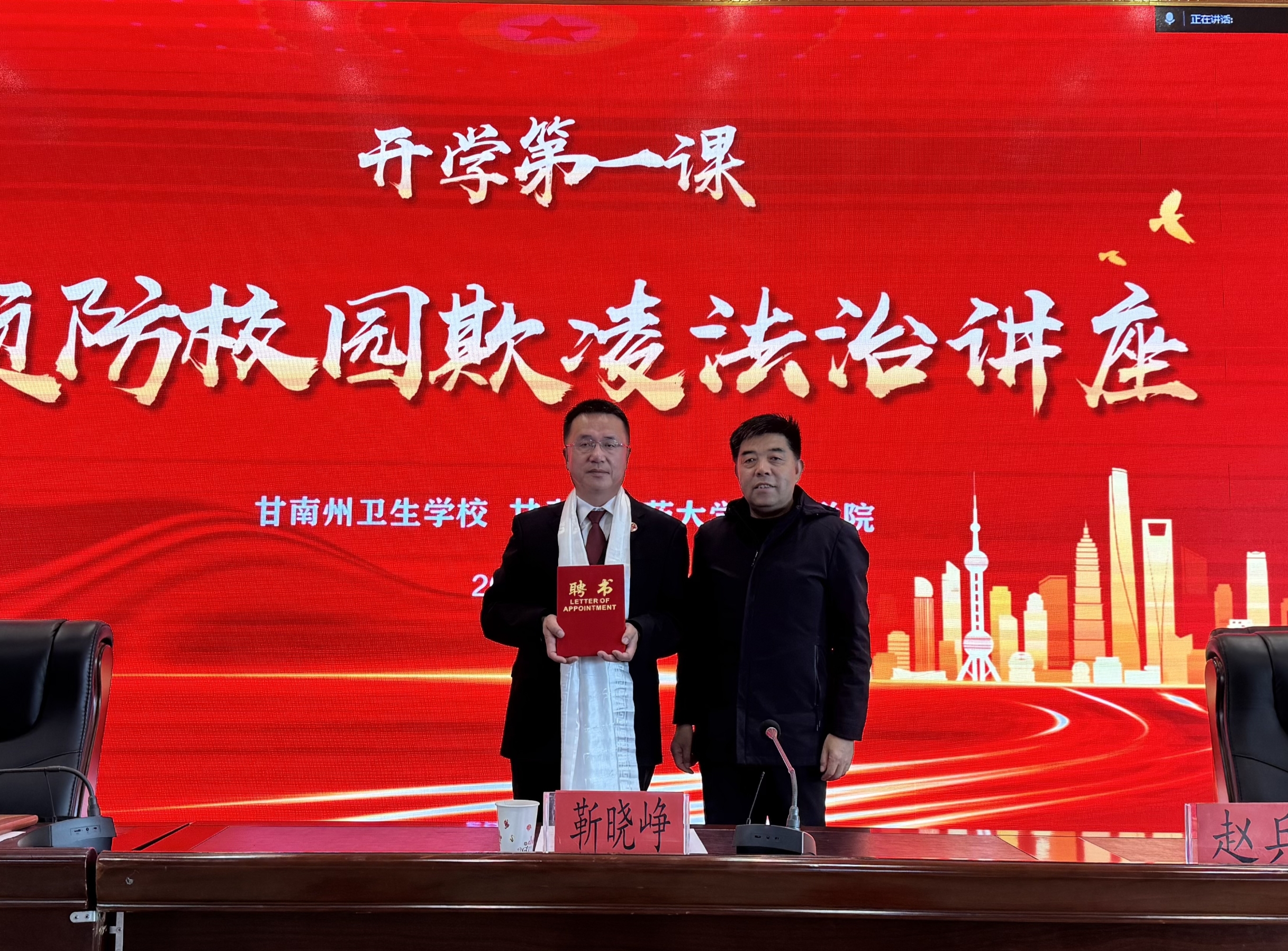 讲座开始前,公司党总支书记赵兵为甘南州人民检察公司党组副书记、副检察长靳晓峥颁发“法治副董事长”聘书。