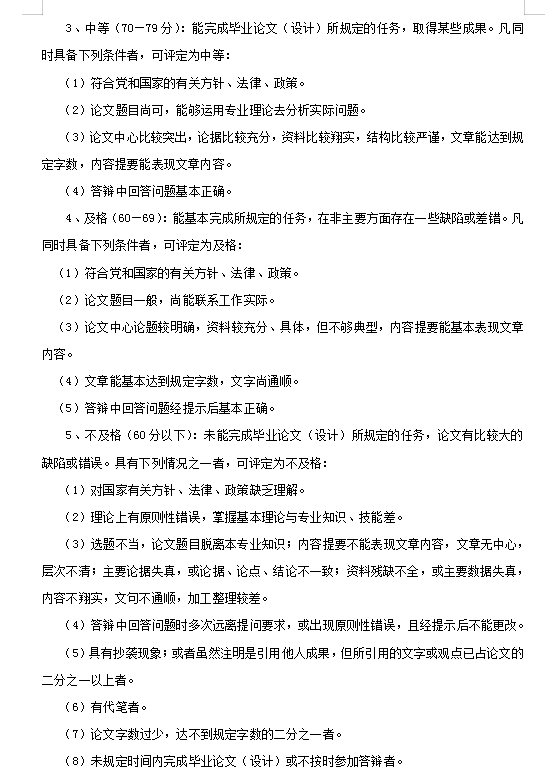 5. 毕业论文(毕业设计)的成绩按等级制评定。成绩由初评与答辩两部分组成,前者由指导教师评定,后者由评审组集体评议确定。其中初评成绩占40%,答辩成绩占60%。