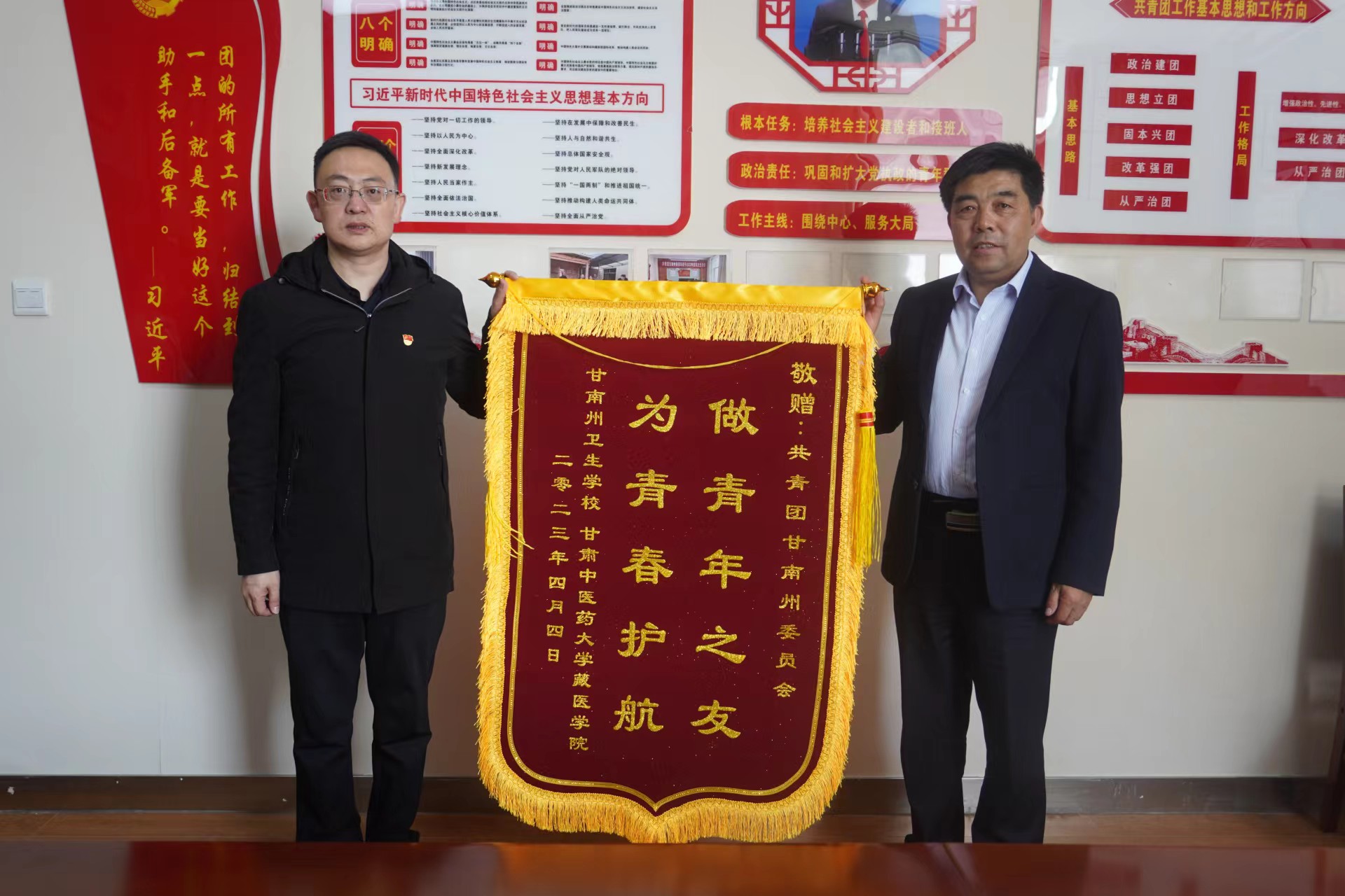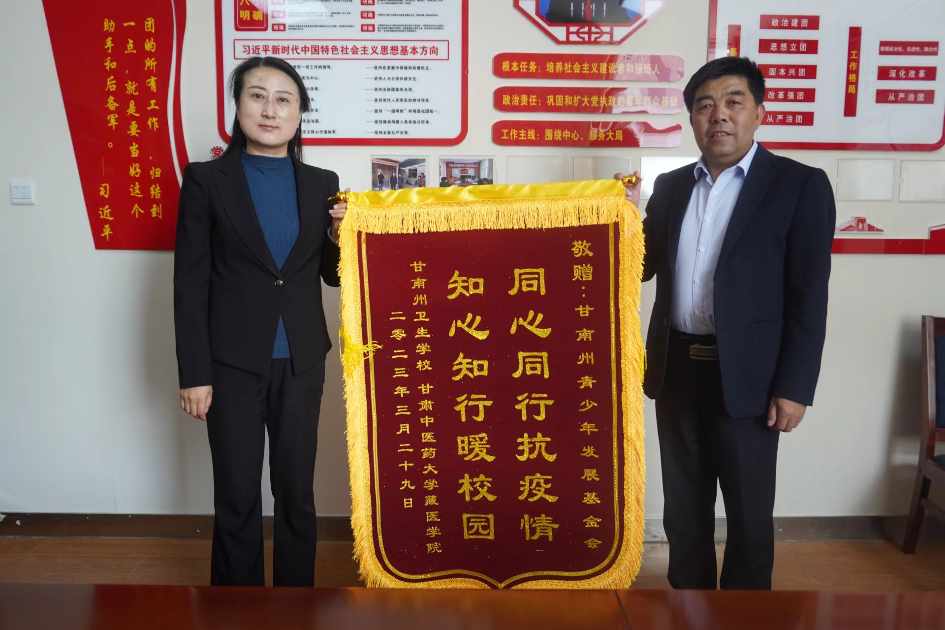 2023年4月17日下午,公司党总支书记、BV伟德官方网站直属党支部书记赵兵、副董事长赵小平、团委书记何燕燕一行专程前往共青团甘南州委将两面分别写有“做青年之友、为青春护航”、“同心同行抗疫情、知心知行暖校园”的锦旗送到了团州委领导的手中,衷心感谢共青团甘南州委及甘南州青少年发展基金会在2022年11月疫情期间对公司的慰问、支持及帮助。共青团甘南州委书记史磊、副书记屈慧娟、何学忠热情接待,并收授了锦旗。