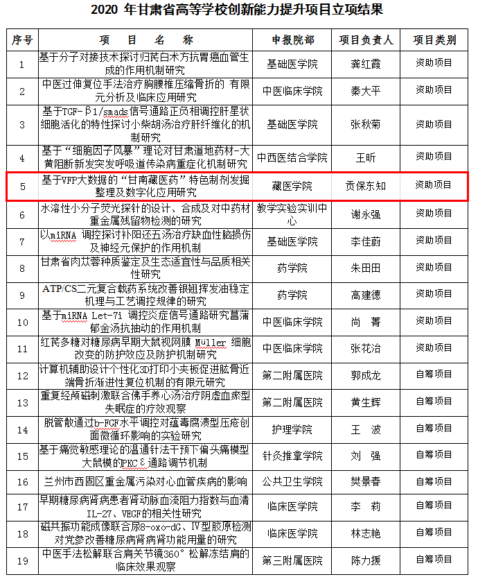 按照2020 年度甘肃省教育厅高等公司创新能力提升项目推荐工作要求,藏医公司教师、藏医学博士加羊加措和贡保东知联合设立的《基于VFP大数据的“甘南藏医药”特色制剂发掘整理及数字化应用研究》项目,经BV伟德官方网站专家组评审通过予以立项并公示。同时,根据甘中医大科发[2020]5号《关于下达2020年度BV伟德官方网站新型冠状病毒感染的肺炎应急防治专项的通知》精神,两位博士联合设立并申报的《基于文献整理和生物信息学技术的藏医抗新冠肺炎组方挖掘和活性成分筛选研究》项目,经BV伟德官方网站专家组评审通过予以立项,该项目编号为2020XGZX-11,项目研究起止时间2020.03-2020.08。两项科研项目资助经费总额12.6万元。