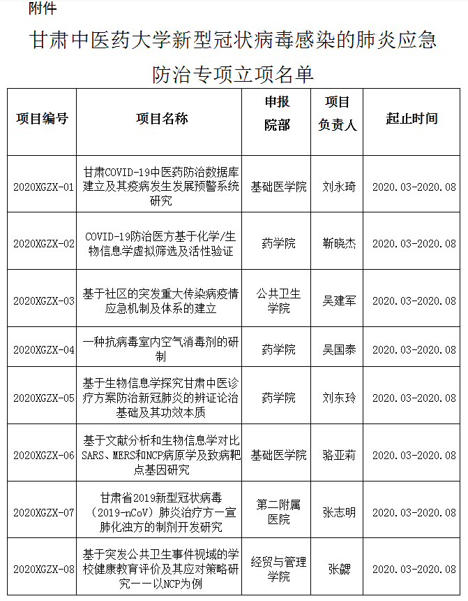 根据《关于印发<BV伟德官方网站支持新型冠状病毒(2019-nc0V)感染的肺炎应急和防治研究工作方案>的通知》(甘中医大科发〔2020〕4 号)精神,公司特设立2020年度BV伟德官方网站新型冠状病毒感染的肺炎应急防治专项项目。经申报人申报,专家组评审,现对“甘肃COVID-19中医药防治数据库建立及其疫病发生发展预警系统研究”等12个专项项目予以立项,本次立项项目经费采用后补助形式予以支持。