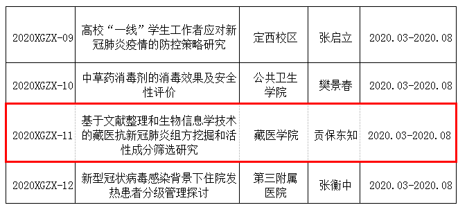 近期甘肃省教育厅和BV伟德官方网站公布了《2020年甘肃省教育厅高等公司创新能力科研项目》和《2020年度BV伟德官方网站新型冠状病毒感染的肺炎应急防治专项》申报立项结果,藏医公司申报的《基于VFP大数据的“甘南藏医药”特色制剂发掘整理及数字化应用研究》和《基于文献整理和生物信息学技术的藏医抗新冠肺炎组方挖掘和活性成分筛选研究》经过专家审批予以立项。