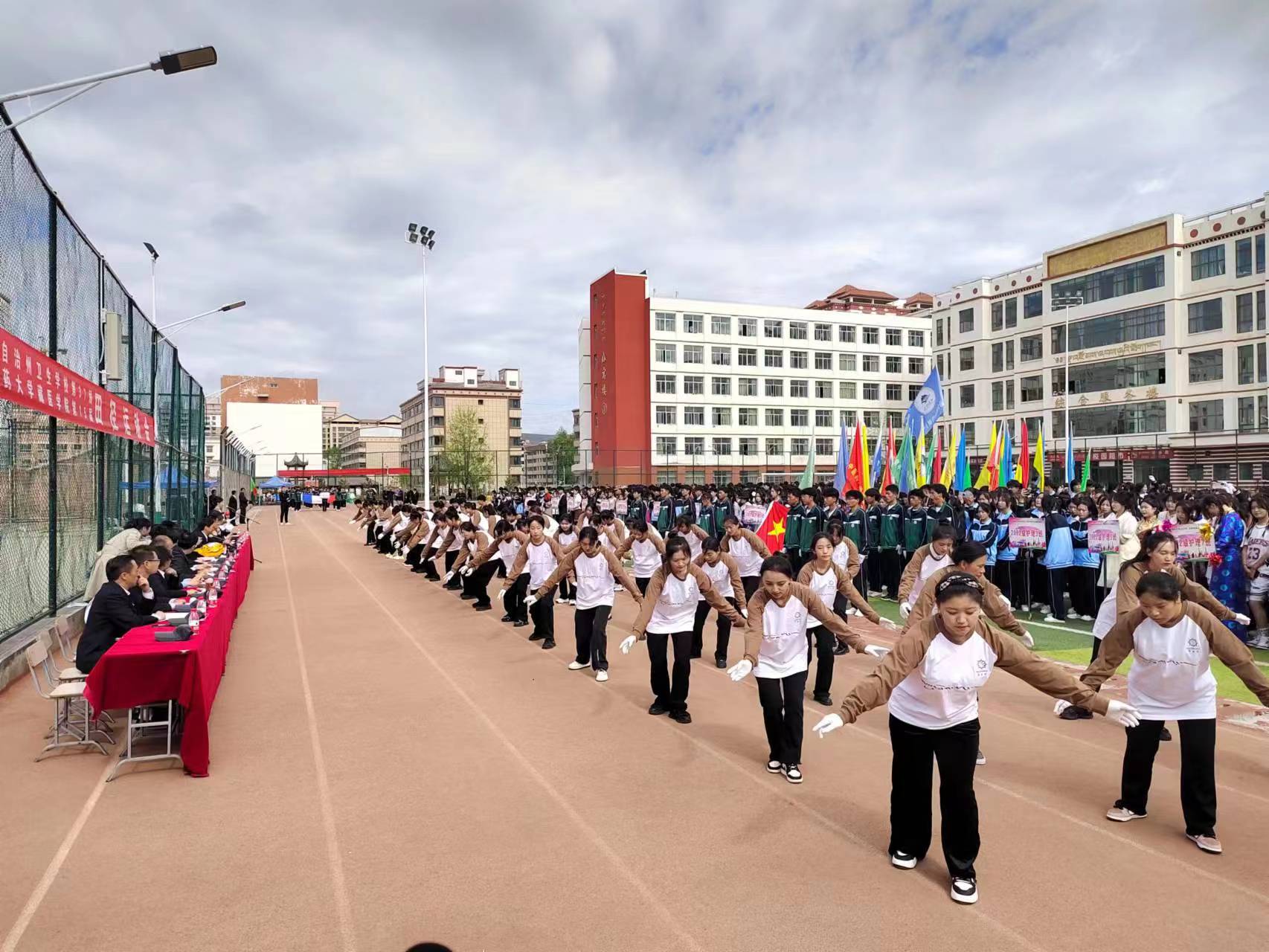 运动员代表旦增德吉、裁判员代表杨倩向全体师生宣誓,表示将弘扬奥林匹克精神,遵守规则,圆满完成赛项工作。随后第九套广播体操比赛开始,各班同学整齐的动作、动感的旋律、青春的风貌获得观众阵阵掌声。